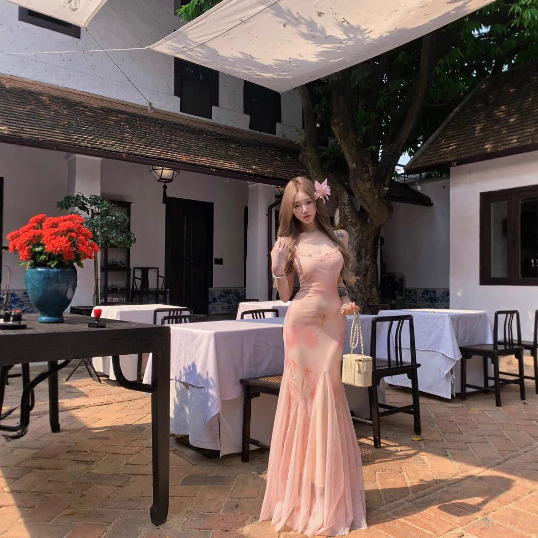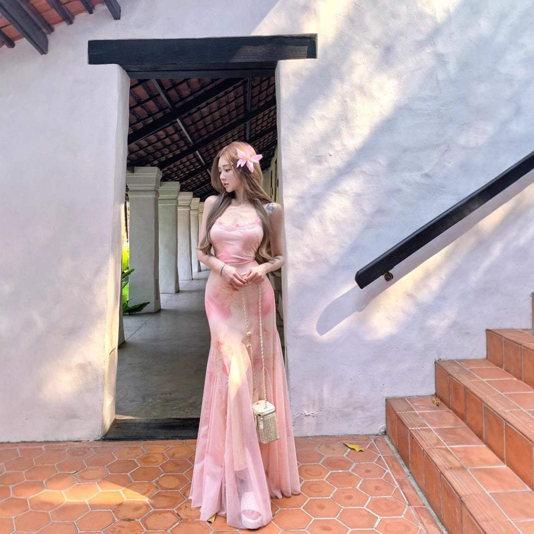 Lace Stitching Printing Straps Tulle Fishtail Dress